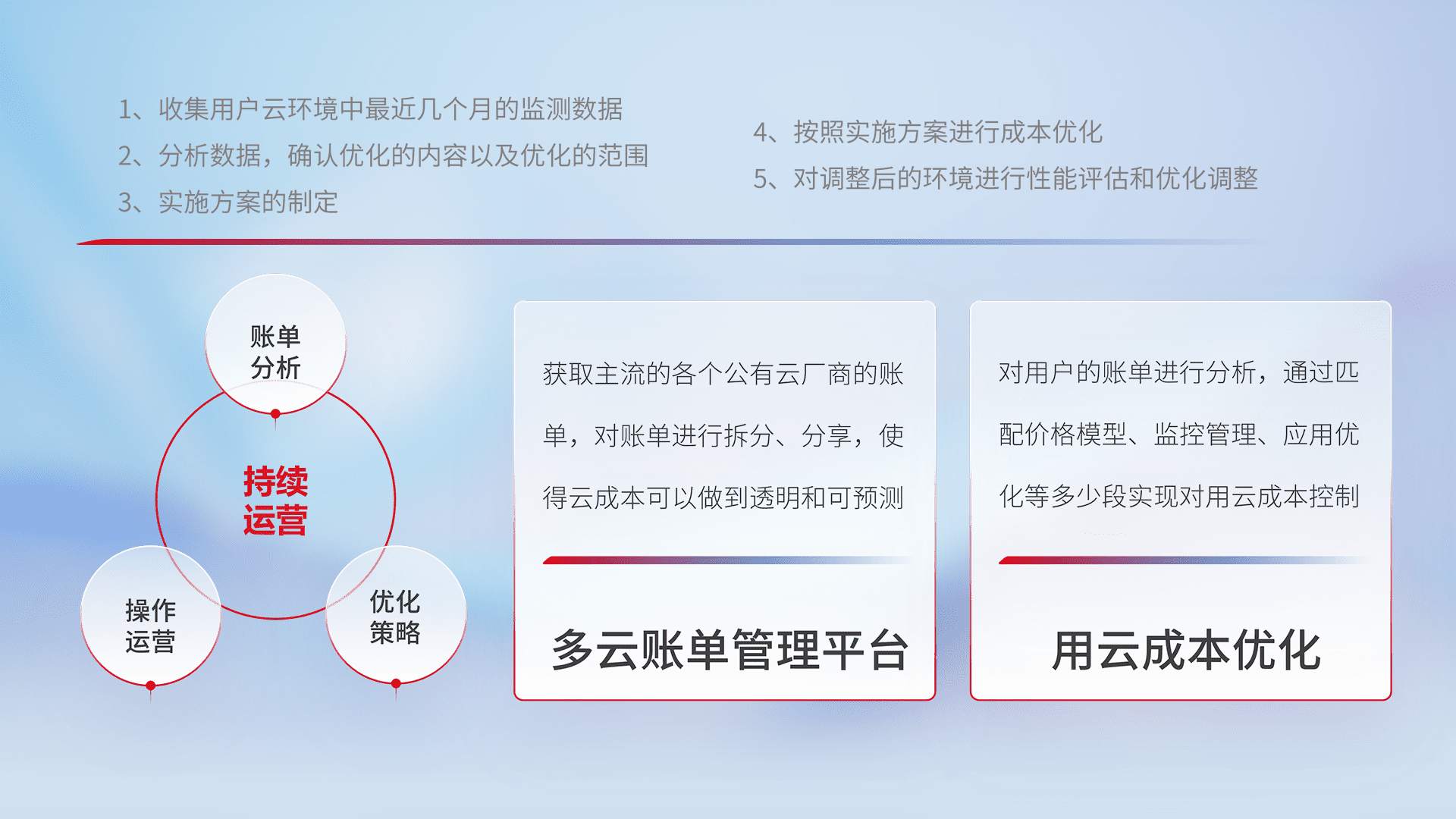 通过多云纳管,,以统一的资源数据模型把客户的云资源进行抽象和封装,,进而实现对多云资源的统一操作,,,,保障云资源管理的可靠性、、稳定性与可用性。。。。量身定制化运维内容,,,,配置、、、、开发运维、、、补丁管理、、备份、、、、监控、、、认证和访问管理、、、审计和日常巡检等,,保障在用云过程中的可靠度,,,,稳定度以及高可用率。。。